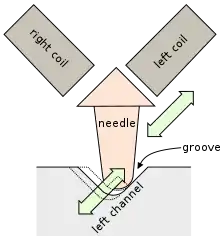 Pickup'en skal kunne følge to bevægelser, op ad den ene side af rillen og op ad den anden side, hvis pladen, der skal afspilles, er i stereo. Dvs. der er to transducere i hovedet.