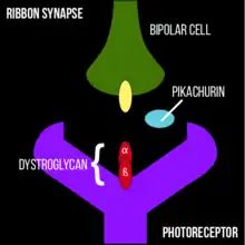 Pikachurin er et dystroglycan-interagerende protein der har en essentiel rolle i den præcise interaktion imellem fotoreceptorer og ribbon synapser og de bipolare dendriter.[2] En ukorrekt binding imellem pikachurin og dystroglycan er forbundet med en type muskelsvind, der ofte involverer anormaliteter i øjnene.[4]