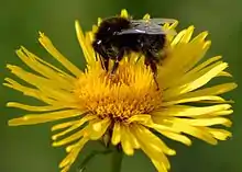 Blomstringen foregår i juli-august, hvor man finder blomsterkurvene endestillet på alle stængelforgreninger. Kurvesvøbbladene er korte med fine hår. Randkronerne er tungeformede, mens skivekronerne er rørformede. Alle blomster i kurven er varmt gule. Frugterne er nødder med hårformet fnok.