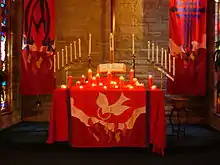 De liturgiske fejringer af pinsen i de vestlige kirker er lige så detaljerede og varierede som i østkirken. Rød, som symboliserer glæden og ilden fra Helligånden, er pinsens farve i de vestlige kirker. Præster, forstandere og kormedlemmer bærer røde liturgiske klæder, og det er nogle steder også blevet almindeligere, at menigheden klæder sig i rødt. Røde bannere bliver ofte hængt på væggene eller fra taget for at symbolisere den "stormende, mægtige vind" skildret i Apostlenes Gerninger[8] og Den hellige Ånds frie udfoldelse. På bannerne kan det være broderet symboler som en due, flammer, symboler for kirken som Noas ark og granatæblet. I evangelisk og reformert tradition finder man ofte ord i stedet for billeder som opremsningen af de syv åndsgaver og Den hellige Ånds frugter. Røde blomster på alteret eller ved prædikestolen som pelargonium kan være plantet rundt om kirken. Traditionen med en enkelt plante findes både i katolske og protestantiske menigheder.