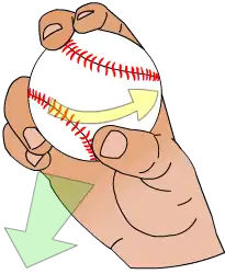 - En splitter eller forkball har essentielt set den samme effekt som en sinker, men den holdes med pege- og langfingeren spredt rundt om bolden.