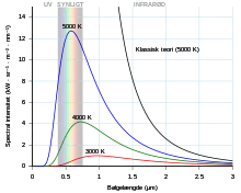 Plancks strålingslov som funktion af bølgelængde. Det ses, at radiansen topper ved en kortere bølgelængde, jo højere temperaturen bliver. Den klassiske model - Rayleigh-Jeans' strålingslov - divergerer fejlagtigt for lave bølgelængder, hvilket kaldes for den ultraviolette katastrofe.