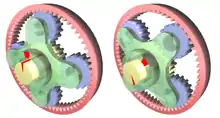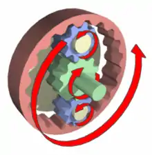 - Ringhjulet (også kendt som månehjulet): Den ydre kant med indvendig fortanding som har indgreb med planethjulene.