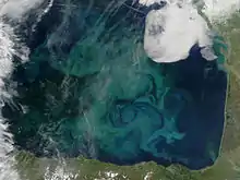 Nogle gange er planteplankton så talrige, at de kan ses fra satellitter. Billedet er over Danmark. Plankton ses især i Vesterhavet, Skagerrak og noget af Kattegat omkring Læsø.