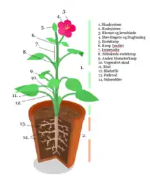 Når kimen er spiret frem fra sit frø eller sin moderplante, begynder den at danne ekstra organer (blade, stængler og rødder) i den proces, som kaldes organogenese. Nye rødder vokser frem fra rodens meristemer, der findes ved rodspidsen, og stængler og blade vokser ud fra skudmeristemerne, der findes i skudspidsen.[6] Forgreninger opstår, når små klumper af delingsdygtige celler, som er blevet efterladt af meristemet, endnu ikke har gennemgået celledifferentiering til specialiserede væv og begynder at vokse som en ny skudspids eller rodspids. Vækst fra ethvert af disse meristemer ved skud- eller rodspidserne kaldes primær vækst og fører til en forlængelse af samme skud eller rod. Sekundær vækst opstår ved fortykkelse af skud eller rod, opstået ved deling af celler i deres kambium.[7]