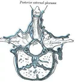 ![]() Venenetværket omkring en ryghvirvel set fra oven. Plexus venosus vertebralis internus omringer rygmarvens dura mater. | |