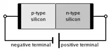 I fremad-bias bliver p-type halvlederen forbundet med den positive terminal - og n-type halvlederen bliver forbundet med den negative terminal.