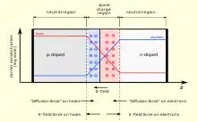 Det elektriske felt skabt af rumladningsområdet modsætter sig diffusionsprocessen for både elektroner og huller. Dette er to samtidige fænomener: Diffusionsprocessen har en tendens til at skabe mere rumladning - og det genererede elektriske felt af rumladningen som modvirker diffusionen. Ladningskoncentrationsprofilen ved ligevægt er vist i figur A med blå og røde linjer. Der er også vist de to modsat balancerende fænomener som tilvejebringer ligevægt.