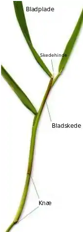 Bladene hos græsserne består altid af to forskellige afsnit: bladskeden og bladpladen. Bladskeden er bladets grund og sidder fast på knæet og omslutter internodiet næsten indtil næste knæ på strået. Bladskederne er hos de fleste græsser åben i den ene side. Hos få græsarter er randene sammenvoksede og dermed bladskeden rørformet lukket, selvom de tidligt revner i den øvre del. Mens de basale bladskeder beskytter vækstpunkterne hos de unge skud, så opfylder stråenes bladskeder denne beskyttelsefunktion for vækstzonerne over knæene og sørger desuden for yderligere stabilitet.