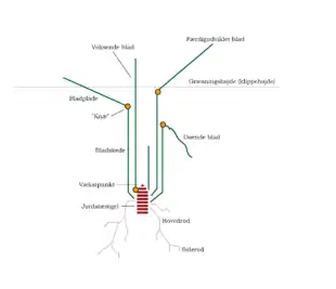Nogle græsser er spinkelt bygget og bliver kun nogle få centimeter store (fx Enårig Rapgræs). Andre arter har forveddede strå og når højder indtil 40 meter eller mere, som eksempelvis bambus-arten Dendrocalamus giganteus. En- og toårige arter har sædvanligvis enkelte eller få skud i løse tuer med bløde blade. Hos disse græsser bærer alle eller de fleste stængler blomsterstande. De længerelevende arter danner i de fleste tilfælde fastere strå og bladplader og danner ud over blomstrende skud et større eller mindre antal ikke blomstrende skud. De vokser i løse eller tætte tuer eller plæneagtigt. Den sidstnævnte vækstform fremkommer, når planterne enten udbreder sig ved hjælp af mere eller mindre lange overjordiske, krybende, grønlige eller rødlige stængler, kaldet stoloner (fx Kryb-Hvene) eller ved hjælp af underjoriske, hvide eller brune rhizomer (fx Alm. Kvik). Ud over farven lader de to typer sig også adskille ved hjælp af knæene på udløberne med rødder: stoloner har på hvert knæ fuldstændige blade med bladskede, hvorimod rhizomer på disse steder blot har små, tynde skælformede lavblade. Hos tuedannende arter dannes kun meget korte udløbere, eller de unge sideskud udvikler sig indeni moderskuddets bladskeder, dette ses hos Fåre-Svingel. På denne måde opstår på grund af de tæt sammentrængte skud den typisk tueformede vækstform hos mange græsser. De fleste græsser har trævlerødder; de danner ingen hoved- eller pælerod. Ved stængelgrunden og ved udløbernes knæ dannes talrige rødder, der hver især kan udvikle siderødder af 1. og 2. orden. På denne måde kan der opstå rodsystemer med en betragtelig størrelse. Således kan en enkelt plante af Rød Svingel eksempelvis udbrede sig 250 meter i diameter.[1]
