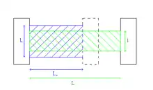 Når det blå materiale strækkes ud til længden L mindskes tykkelsen til l.