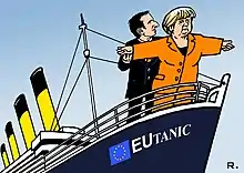 Tegning, der med reference til scene fra filmen Titanic viser Frankrigs Emmanuel Macron og Tysklands Angela Merkel i stævnen på skibet EUtanic