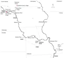 Engang mellem år 1300 og 1500 forlod en stor stamme sine byer af barkhuse og dyrkede arealer i dalene ved Ohio River[3] og fulgte floden vestpå til dens udløb i Mississippi River. Folket søgte over på den anden side af Mississippi i skindbåde, men en gruppe blev fanget i tåge og endte med at sejle ned ad floden. Den blev til quapaw-stammen.[5] Hovedskaren fortsatte nordpå langs Mississippi og drejede op langs Missouri River, da de nåede denne. Gruppen holdt sig samlet lige til Osage River, hvor en del slog sig ned for siden at skilles i osage- og kansa-stammen. De resterende søgte over på østbredden af Missouri River og vandrede videre nordpå ad en ikke ganske fastlagt rute. Iowa-indianerne fulgte dem på vejen efter at have sluttet sig til gruppen på et eller andet tidspunkt.[3]