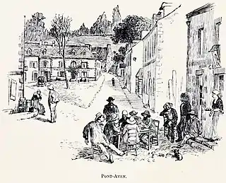 ![]() Sammenkomst på plads i Pont-Aven Kunstnere udenfor pensionatet (1880) Hôtel de Voyageurs i baggrunden Træstik, illustration af Randolph Caldecott til rejsebog fra 1880[1] | |