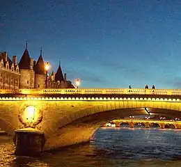 Flere broer med navnet Pont au Change har været beliggende på dette sted. Broen har fået sit navn efter guldsmede og pengeudlånere som opstillede deres forretninger på tidligere udgaver af broen i det 12. århundrede.[1] Den nuværende bro blev bygget fra 1858 til 1860 under Napoleon III's regeringstid og bærer hans kejserlige insignier.