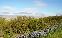 I mellemgrunden ses en rest af den (formodet) oprindelige skov, som fandtes i Island på Landnamstiden. I forgrunden ses blomstrende Alaska-Lupin (Lupinus nootkatensis, der er indført i det 20. århundrede.