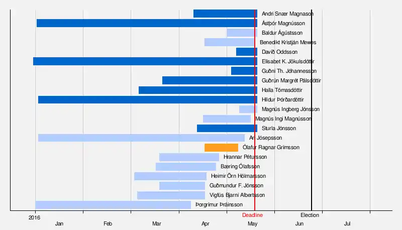 - Katrín Jakobsdóttir - formand for Venstrepartiet – De Grønne, førte i meningsmålingerne, men bekendtgjorde 15. marts, at hun ikke er kandidat.[17]