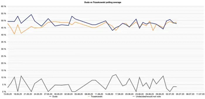 Ved første valgrunde den 28. juni fik Andrzej Duda fra Lov og Retfærdighed[lower-alpha 1] 43,5% og Rafał Trzaskowski fra Borgerplatformen 30,5% af stemmerne og disse gik videre til den afgørende anden valgrunde, der afholdes den 12. juli.[8]