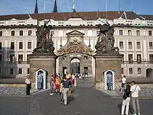 Indgangen til borgen findes mod vest ved Hradčanské námeŝti, og her kommer man ind i første borggård. Denne efterfølges af anden og tredje borggård. I nordenden af anden borggård finder man Borggalleriet, som oprindeligt var en staldbygning. Rudolf 2. opbyggede en stor kunstsamling, som dog senere blev plyndret, men i 1960'erne fandt man 130 malerier herfra af en række store mestre, der efter grundig restaurering nu kan beses i galleriet.