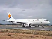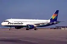 En af Premiair's Airbus A320. Flyet er malet i selskabets første designlinje.