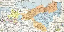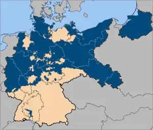 ![]() Preussen (blå) som del af det tyske kejserrige 1871-1918. Lys farve angiver kejserrigets øvrige stater.  | |