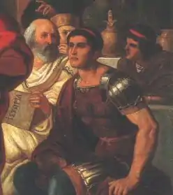 ![]() Priscus (venstre) med den romerske ambassadør ved Attila's hof, holdende sin ΙΣΤΟΡΙΑ (Historie, som maleren ukorrekt har stavet ΙΣΤΩΡΙΑ). (et udsnit af Mór Than's Attila's Gilde. | |