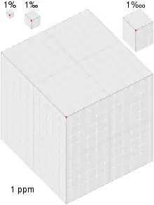 Visualisering af forskellige enheder for andele. Den røde prik viser delen ud af den samlede mængde. Promille ses som nr. 2 fra venstre i toppen.