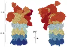 20S-proteasomet er opbygget af 14 subunits, 2 kopier af 7 forskellige homologe polypeptider, der alle antager cirka samme konformation. Den samlede masse af 20S-proteasomet er 700 kDa. De enkelte subunits er arrangeret i to cirkler på 7 subunits; disse er så placeret ovenpå hinanden så der dannes en tønde-lignende form. Proteasomets substrater nedbrydes inde i midten af tøndestrukturen, hvor de aktive sites befinder sig.