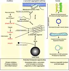 Alzheimers sygdom og andre lidelser er karakteriseret ved akkumulering af tau-proteinet i fibrillære aggregater og betegnes som en tauopati. I den aldrende hjerne kan flere proteopatier overlappe hinanden. For eksempel, ud over tauopati og Aβ-amyloidose (som eksisterer sideløbende som patologiske nøgletræk ved Alzheimers sygdom), har mange Alzheimerpatienter samtidig synucleinopati (Lewy-legemer) i hjernen.