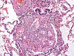 ![]() Billede der viser en læsion i lungerne forårsaget af pulmonal arteriel hypertension. | |