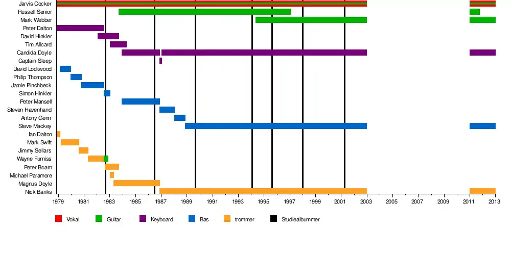 Gruppen havde Jarvis Cocker en frontfigur, som i 90'erne ofte var forsidestof i de britiske tabloidblade. Derudover bestod gruppen af Russell Senior, Candida Doyle, Nick Banks, Steve Mackey og Mark Webber.