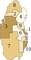 ![]() Placering og udstrækning af Qatar (mørkegrøn) på den Arabiske Halvø. | |