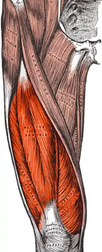 - Rectus femoris er på midten af låret, og dækker det meste af de tre andre muskler. Det fæster på ilium. Navnet stammer fra dens lige bane.