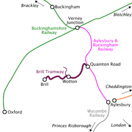 - Da den blev bygget havde hertugen af Buckinghams sporvej ikke noget officielt, den blev internt omtalt som "The Quainton Tramway".[23] Efter forlængelsen i 1872 og ombygningen til passagertransport, fik den officielt navnet "Wotton Tramway".[23] Den 1. april 1894 blev Wotton Tramway overtaget af Oxford & Aylesbury Tramroad, og beholdt officielt O&AT navnet indtil lukningen i 1935, selv om den aldrig førte hverken til Oxford eller til Aylesbury.[24] Den var almindelig kendt som Brill Tramway fra 1872 og frem (og omtalt som sådan i nogle officielle papirer, såsom aftalen der grundlagde Metropolitan and Great Central Joint Committee[25]), og som Metropolitan Railway Brill Branch fra 1899 til 1935, men ingen af disse var officielle betegnelser.[1]