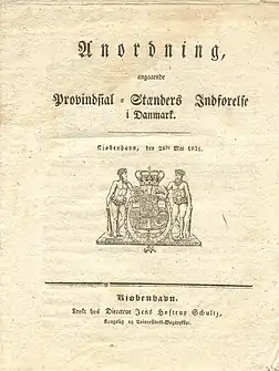 Den færdige stænderforfatning for det danske monarki hvilede på de to anordninger af 28. maj 1831 og på de fire forordninger af 15. maj 1834.[9]