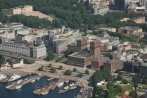 Rådhusbryggerne foran Rådhuspladsen og Oslo rådhus med Akershusstranda nedenfor Akershus Slot foran og til venstre i billedet.