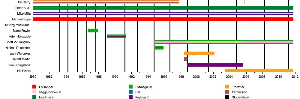 - Bill Berry – trommer, percussion, baggrundsvokal (1980–1997; gæsteoptræden i 2003, 2005, 2006, 2007)