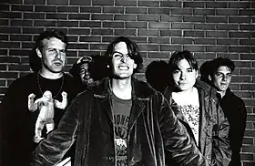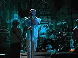 ![]() R.E.M. til en koncert i Padova, Italien, i jil 2003. Fra venstre til højre: tour musiker Scott McCaughey, Michael Stipe, tour trommeslager Bill Rieflin and Peter Buck.  | |