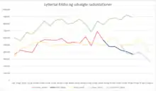 Graf over udviklingen for lyttertallene på R4dio henholdsvis Radio24syv i 2011, 2018 og 2019 samt DR P1 i 2019. Alle tal baserer sig på Kantar Gallups Radio-meter analyse, der udkommer ugentligt. (http://tvm.tns-gallup.dk/tvm/rpm/default.htm)
