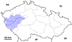 Dens største bifloder er Zubřina, Merklinka og Úhlava. Den er 111,5 km lang, og dens afvandingsområde er omkring 2.191,8 km² heraf 2.182 km² i Tjekkiet.[4]