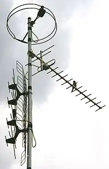 Tre antenner fra oven: Rundstrålende FM-antenne, kort Yagi UHF-antenne, anden UHF-antenne af typen "fluesmækker" eller rettere fire stackede butterfly-dipoler med gitterreflektor.