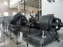 VLF Alexanderson-alternator ved Grimeton. Den højre del er elmotor med variabel hastighed. I midten er gear. I venstre side er den roterende mekanisk højfrekvensgenerator, som ved rette hastighed laver vekselstrøm ved 17,200 kHz. (Disse 17,200 kHz vekselstrøm sendes til den seksmasters radioantenne.)