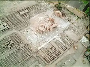 Luftfoto af Theben, Rammesseum. Søjler og en overbygning kan ses.