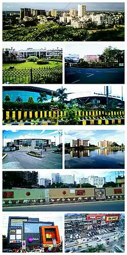 Øverst tv. mod højre: Kanke, Ranchi Togstation , Rajendra chowk , Birsa Munda International Airport , JSCA International Cricket Stadium , Line tank pond, Kadru flyover-Hotel Radisson Blu, Nucleus mall og GEL church complex. | |