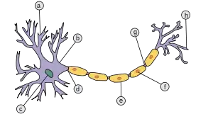 Simpel oversigt over nervecellens opbygning. a: Dendrit, b: Cellelegeme, c: Cellekerne, d: Aksonets rod, e, Myelinskede, f: Schwann Celle, g: Ranviersk indsnøring, h: Synapse