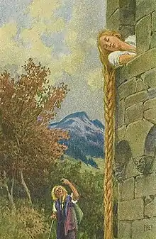 Når Rapunzel hører dette, vikler hun sit hår ud, gør det fast til en krog og lader det falde ud af vinduet, så heksen kan kravle op ad det.