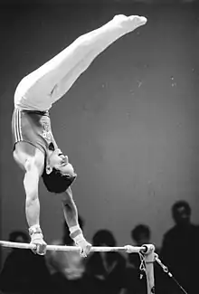 En gymnast fra DDR i øvelser på reck i 1988 for OL i Seoul.