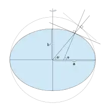 Den geocentriske breddegrad Φ’ er koblet til den geodætiske breddegrad Φ via[1]