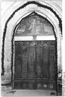 Den oprindelige trædør brændte 1760 under Syvårskrigen. En erstatning i bronze er fra 1857 med de 95 teser.