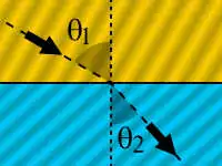 Til højre er vist situationen omkring en skarp grænseflade (vandret sort streg) mellem to regioner (gul og blå) med hver sin udbredelseshastighed for nogle plane bølger (striber i baggrundsmønsteret), som ankommer i en vis vinkel θ1 i forhold til normalretningen (lodret stiplet linje). På den anden side af grænsen bevarer bølgerne deres frekvens, men da udbredelseshastigheden er mindsket, bliver bølgernes længde tilsvarende mindre. For at få bølgetoppe og -dale til at passe sammen i grænsefladen, må bølgerne ændre retning, så de forlader denne i en ny vinkel θ2.